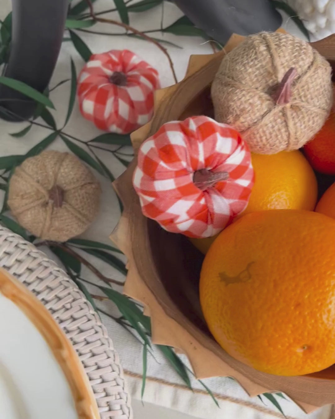 Add a touch of elegant sophistication to your fall decor with the Elegant Checkered Artificial Pumpkin Set. This set includes six beautifully crafted pumpkins, each designed to bring visual interest and rich texture to your space. The unique design features a mix of finishes, including classic orange checkered fabric rustic jute, and beige smooth plastic, creating a perfect blend of styles.