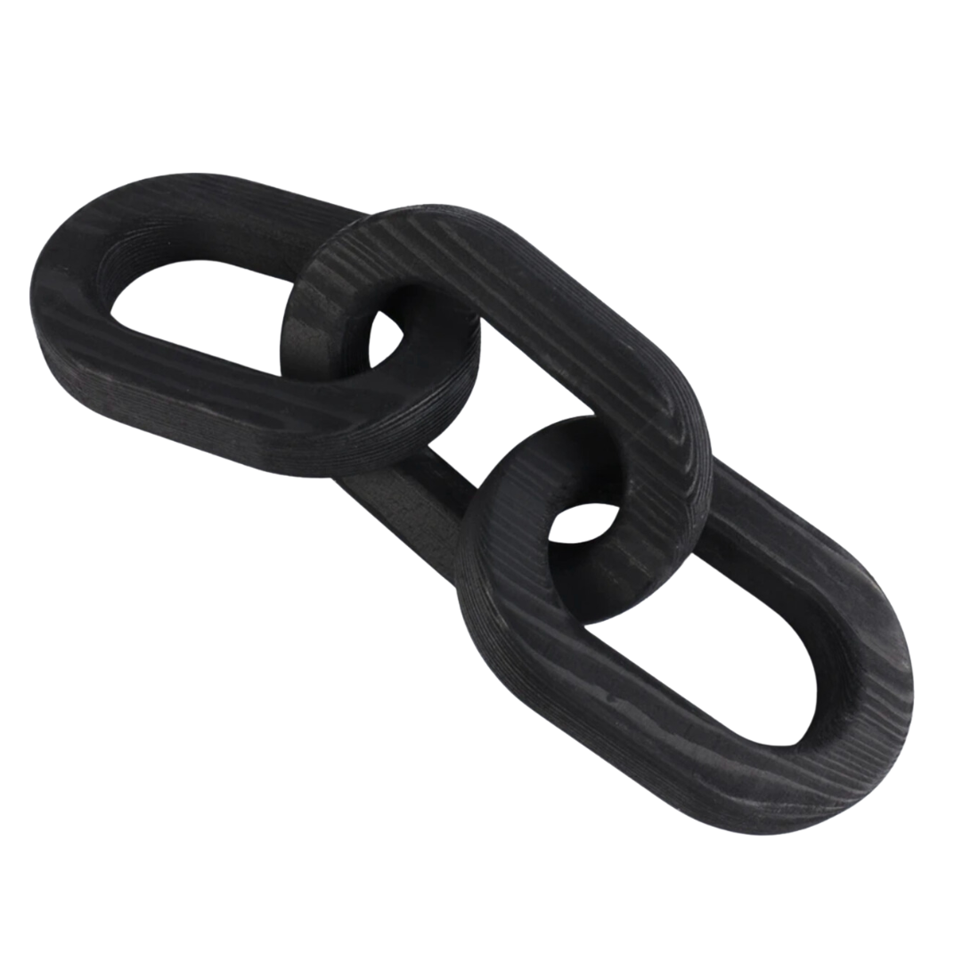 This decorative link chain features a simple design with 3 wooden rings buckled together. Made of natural pine wood, each chain link is finely hand-carved and has a special black-washed craftsmanship that creates a look of the wood while the natural beauty and color still show.